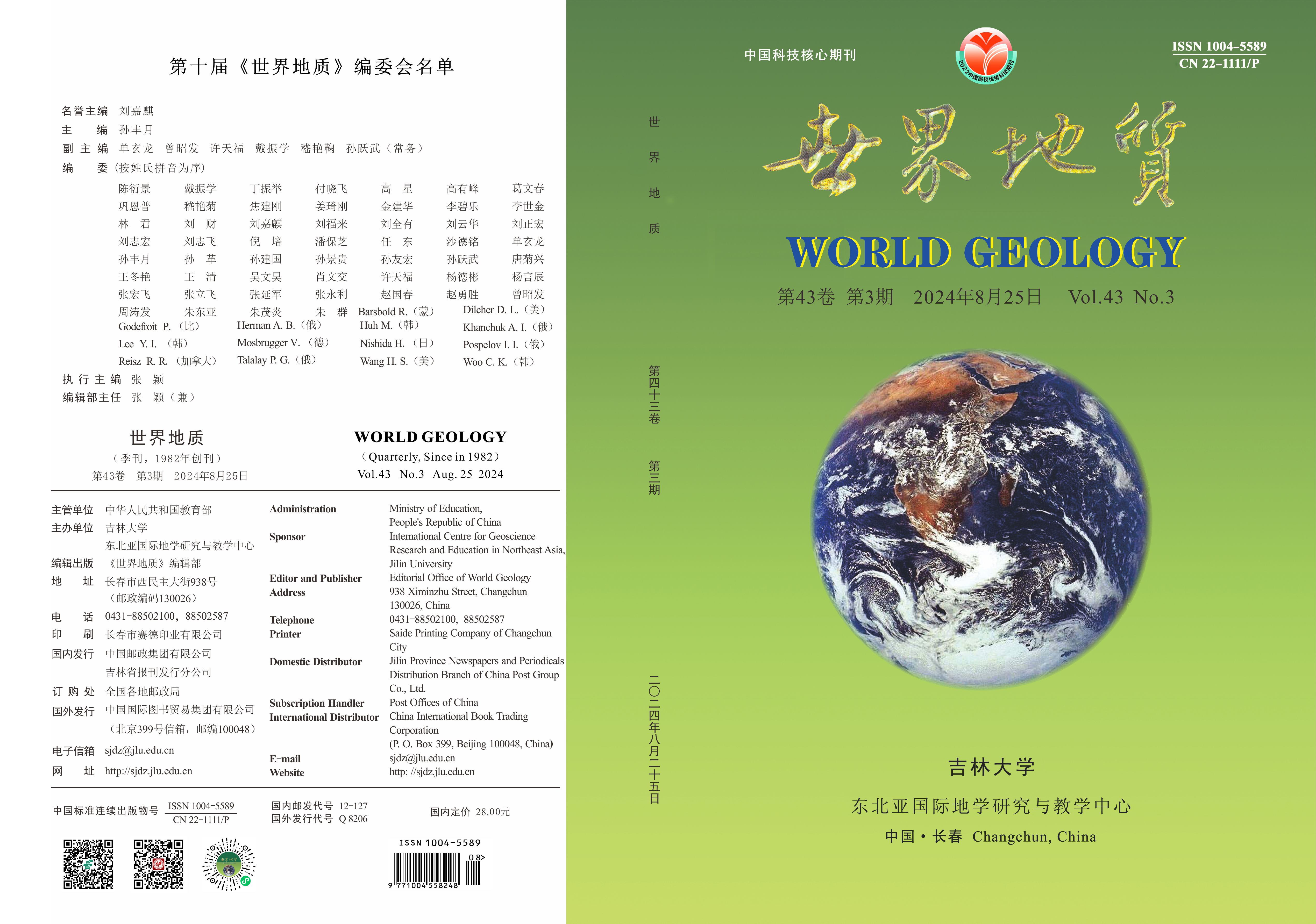 《世界地质》(ISSN1004-5589/CN22-1111/P)是由吉林大学东北亚国际地学研究与教学中心主办的综合性地学学术刊物。本刊遵循“百花齐放,百家争鸣”的方针,以跟踪地学前沿,及时报道全球地学领域里的新发现、新理论和新成果为办刊宗旨,内容涉及基础地质(包括地层、古生物、矿物、岩石、构造和区域地质等)、矿床地质、能源地质、海洋地质、水文地质、工程地质、环境地质(含生态地质和灾害地质)、遥感地质、地球物理、地球化学、勘探工程、地质信息技术和岩矿测试等专业领域。本刊入选中国科技核心期刊,被中国知网、万方数据、重庆维普、美国《化学文摘》(CA)、俄罗斯《文摘杂志》(AJ)、日本科学技术振兴数据库(JST)等多家国内外数据库收录。 《世界地质》由孙丰月教授担任主编,编委会由60多位国内外专家、学者组成,包括14位国外编委。 《世界地质》季中月25日出刊,大16开本。单价每册28元,全年定价112元。国内邮发代号12-127,国外邮发代号Q8206.